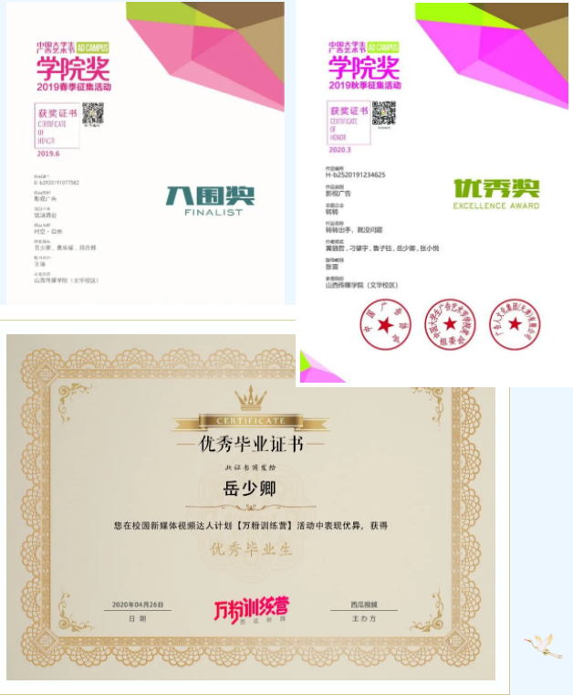 此外,积极参加各种课余实践,不断提高自己的综合素质和专业技能。2020年7月报名第五届中国数据新闻大赛,进入总决赛,作为答辩人,去到西安交通大学,进入全国前30名,最终获得了二等奖的好成绩。响应大学生创新创业号召,积极组织策划大创项目,2019年负责的项目“老顽童(社区)”与2020年负责项目“应有晋有APP”获得太阳集团“互联网+”创新创业大赛三等奖。2020年7月作为负责人上报创新项目《新媒体环境下粉圈文化的“出圈”如何影响大众文化》获得省级立项。