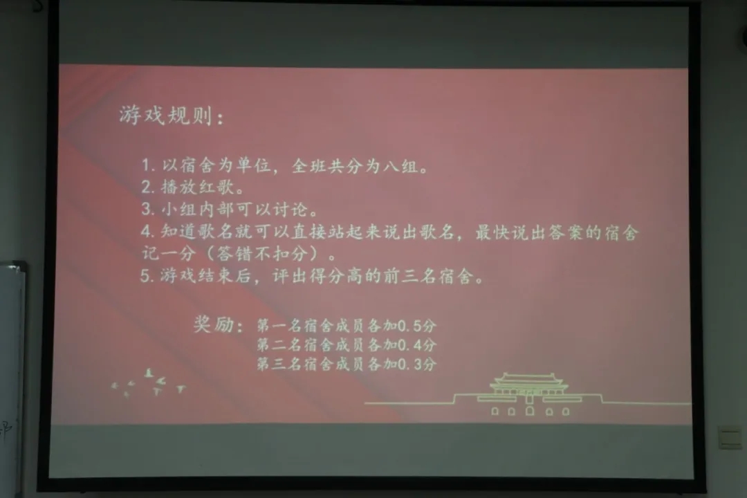 讲解结束,韩晋老师做了总结。接下来进入了听歌识曲的小游戏环节,由李超同学讲解游戏规则。播放的歌曲均是上世纪50~90年代的经典红色歌曲。同学们都积极抢答,体现了自己丰厚的红歌知识储备。最后由425宿舍的同学取得第一名。