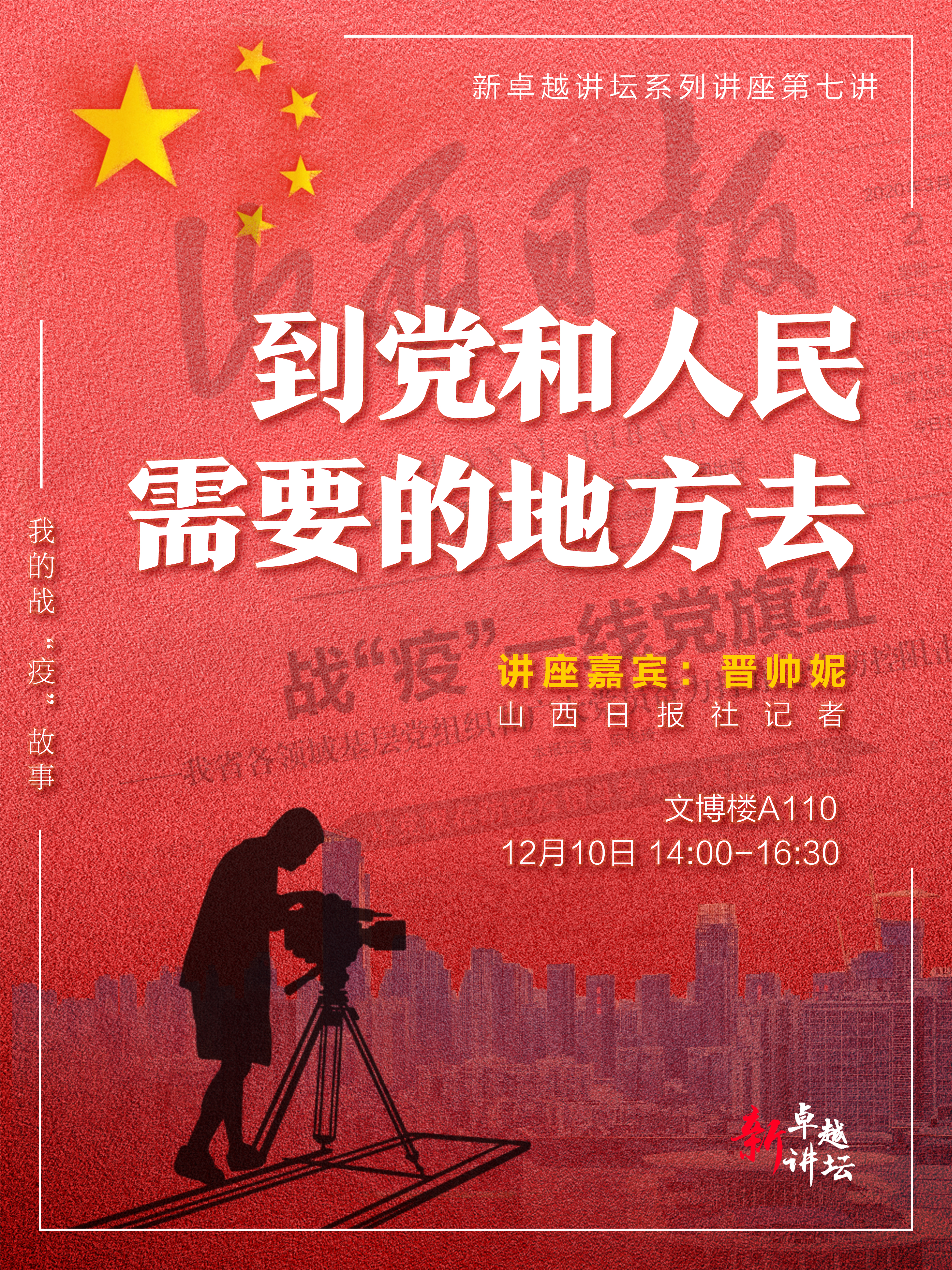 12月10日下午,新卓越讲坛在文博楼A110继续开讲。本次活动以“到党和人民需要的地方去——我的战‘疫’故事”为主题。这是太阳集团tyc138自举办该活动以来的第七讲。
