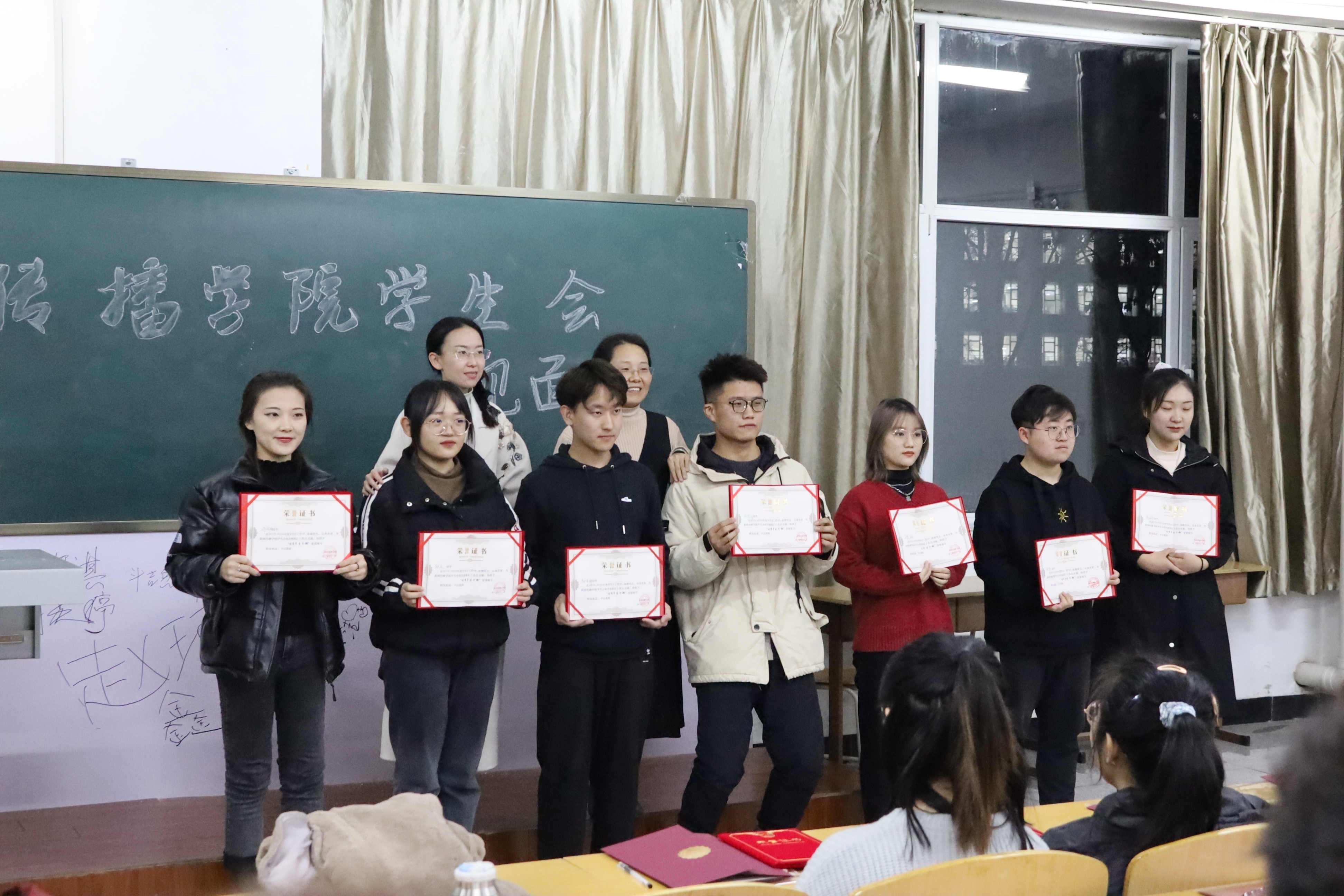 由杨恒瑞同学宣读了上一届为学生会做出成绩的优秀干部表彰名单,张映老师、高杨老师为受表彰的学生颁奖,并合影留念。