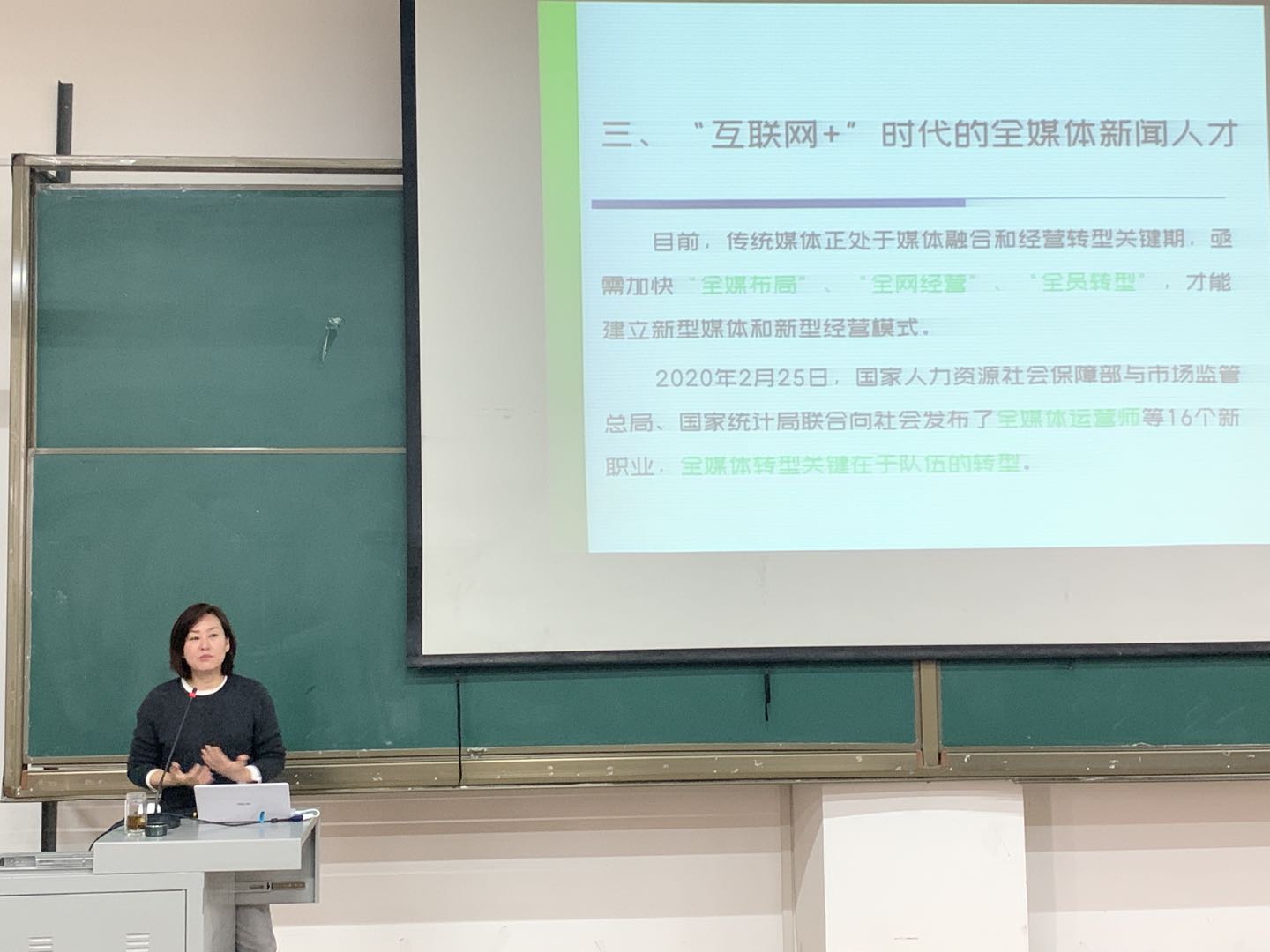 吉仙红主任指出,目前传统媒体正处于媒体融合和经营转型关键期,亟需加快“全媒布局”、“全网经营”、“全员转型”,才能建立新型媒体和新型经营模式。吉主任提到了2020年2月25日国家人力资源社会保障局与市场监管总局、国家统计局联合向社会发布了全媒体运营师等16个新职业,以此指出全媒体转型的关键在于队伍的转变。
