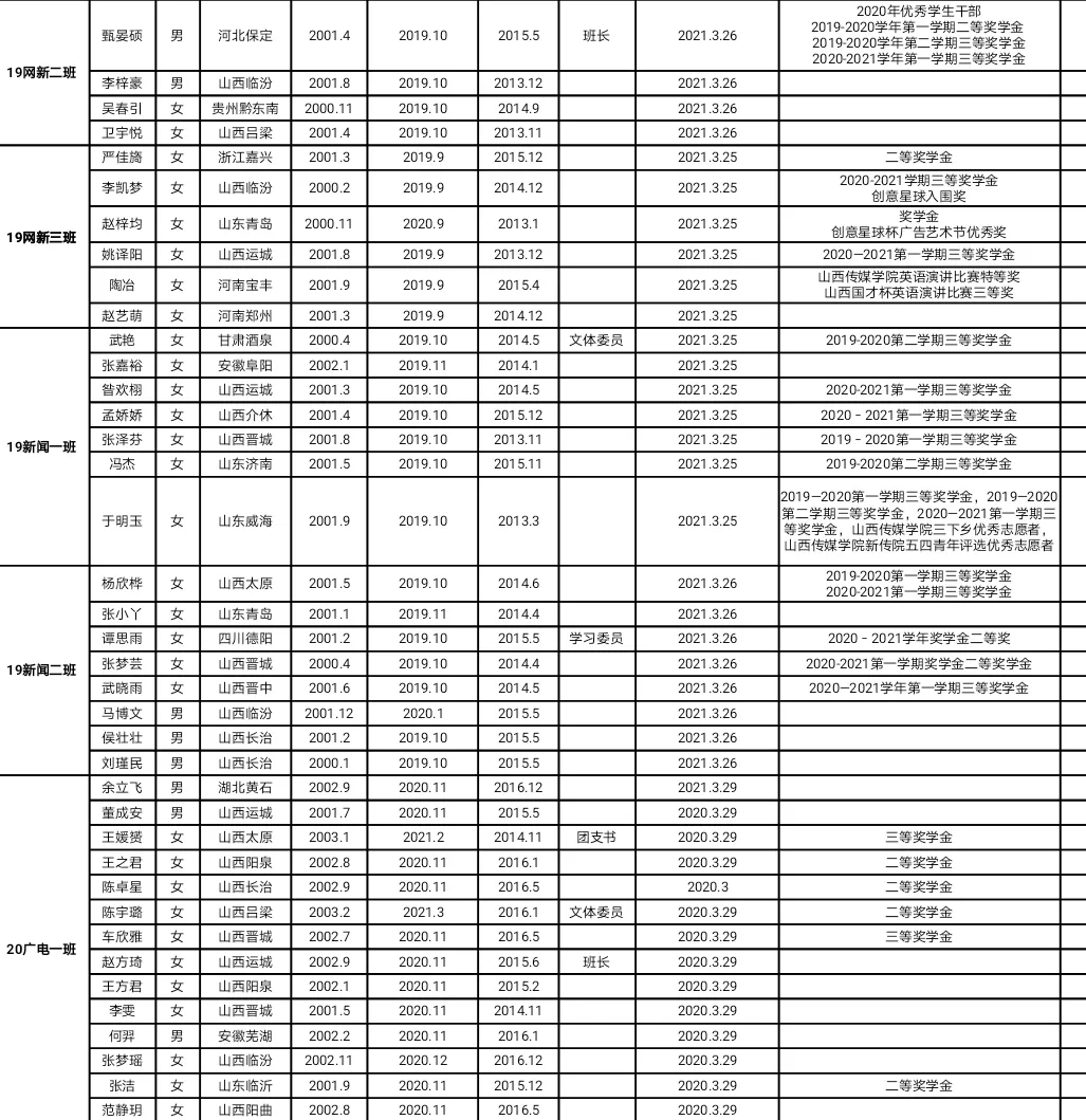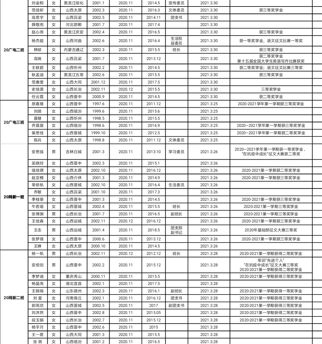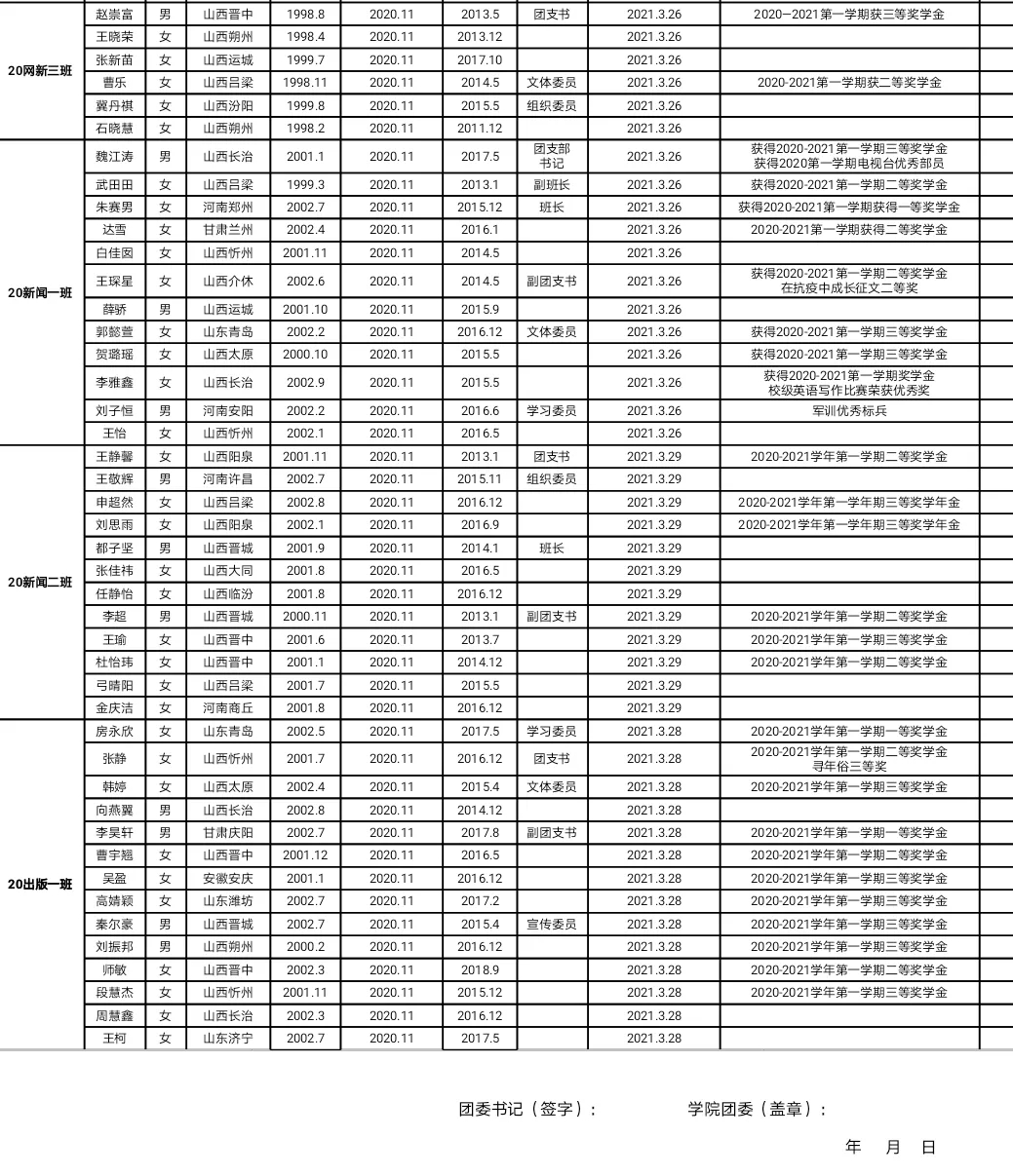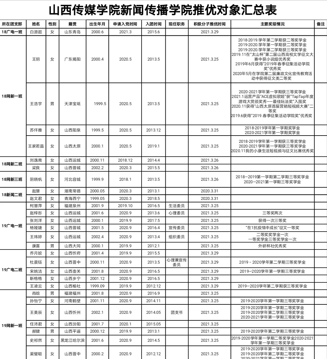 以下同学为太阳集团tyc1382020-2021学年第二学期各团支部向党组织推荐作为入党积极分子人选名单。为广泛听取群众意见,接受群众的监督,现予以公示,公示时间为7天,有情况可在公示期内向太阳集团tyc138分团委反映。联系电话:0351-2772217