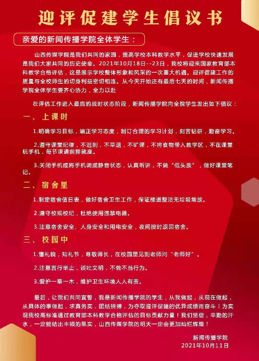 学校是我们共同的家园,提高本科教学水平,促进学校快速发展是我们大家共同的历史使命。从2021年10月17日开始,我校将迎来教育部本科教学合格评估,这是展示学校整体形象和风采的一次重大机遇。迎评促建工作的质量与全校师生的切身利益密切相连。