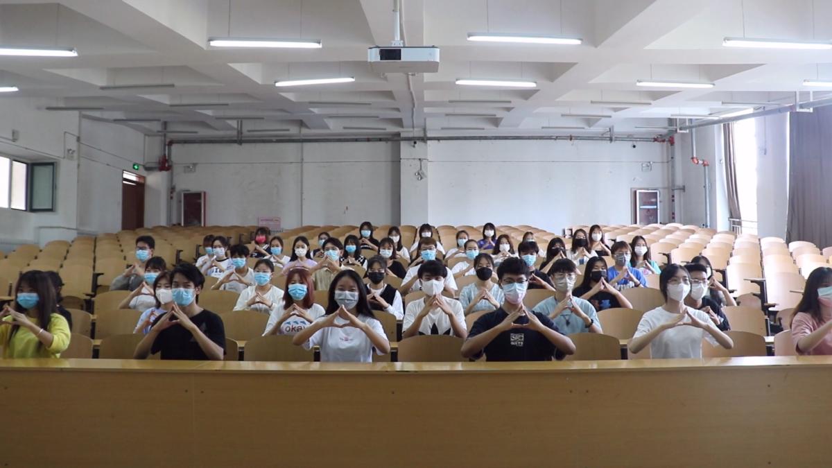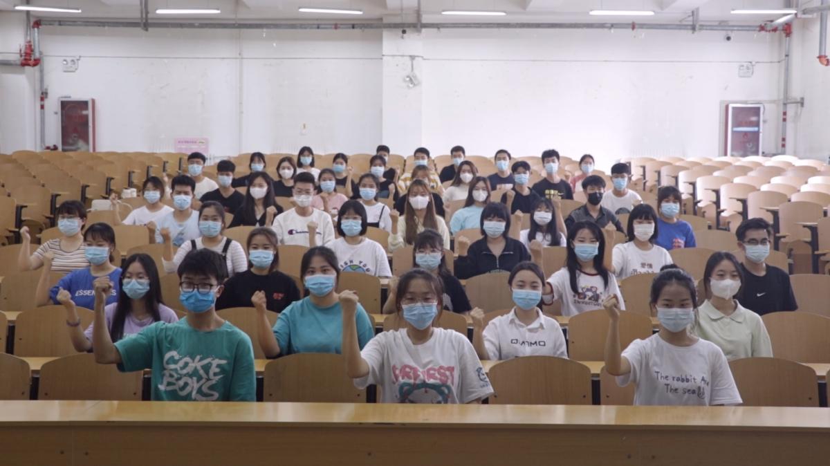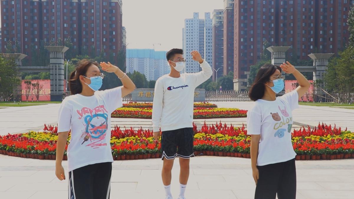20级网络与新媒体一、二班的六名同学在校园中齐跳《大中国》,有力的舞姿表达了对祖国母亲的祝福。