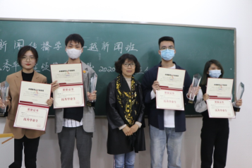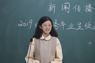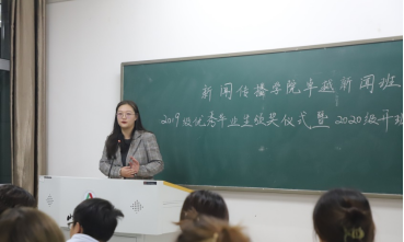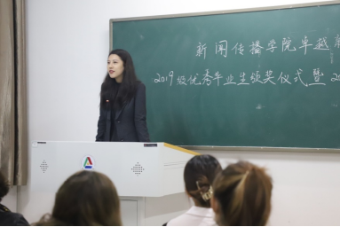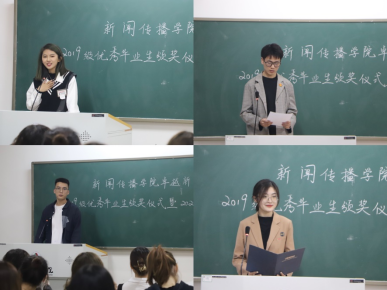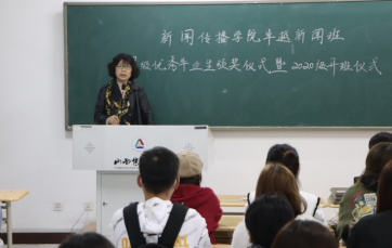 2019级卓越班优秀学员新闻2班韩承果、新闻1班李立禾、新闻1班刘铭昕以及新闻1班陈佳宁为2020级卓越班新生分享了在卓越班一年的时间里获得的经验和成果并送上祝福。2020级卓越班新生代表数字出版1班陈紫仪上台感谢构建卓越班平台的各位老师,希望可以通过卓越班的学习成为有责任、有担当的新闻人。