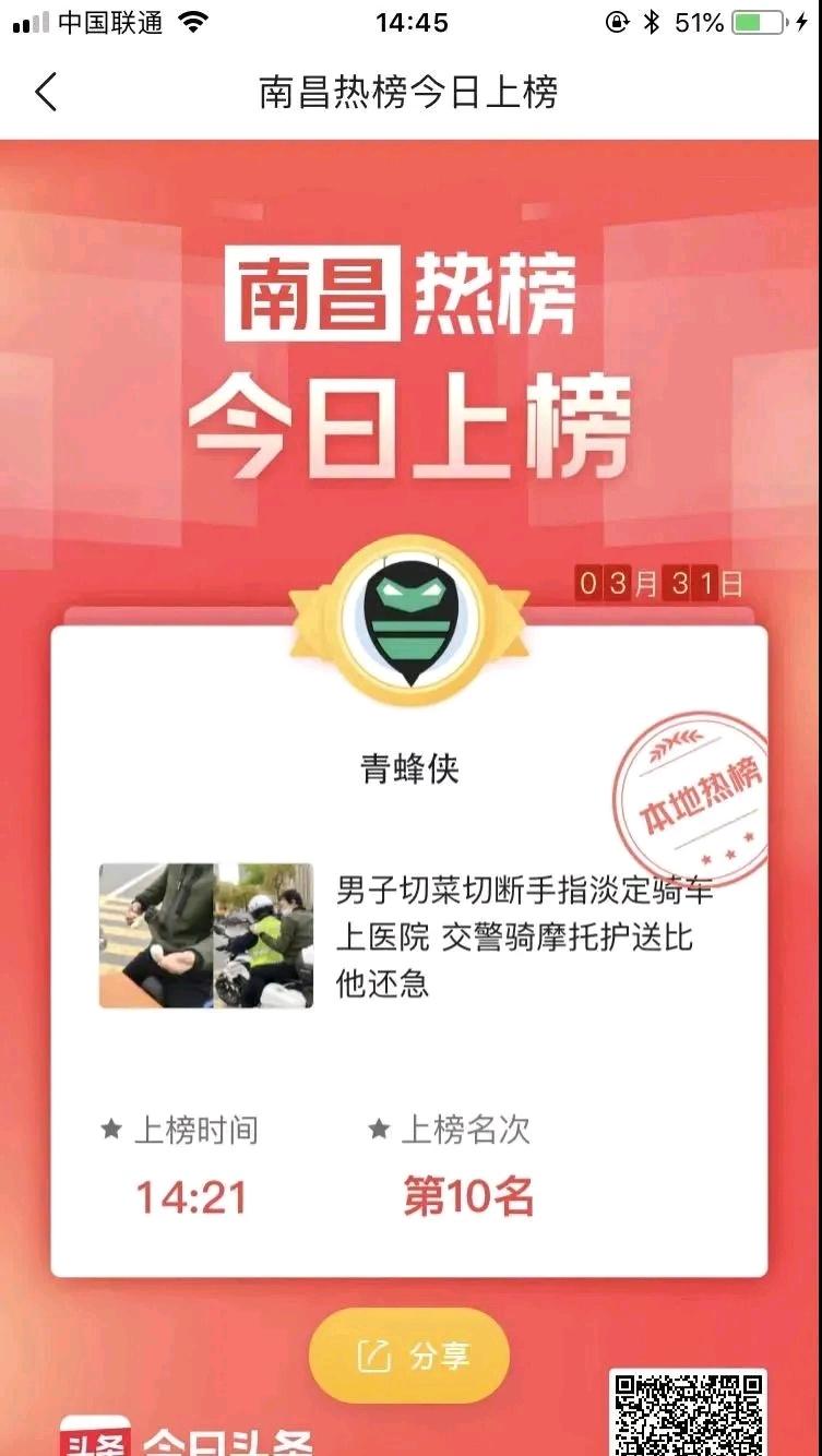 男子切菜切断手指淡定骑车上医院 交警骑摩托护送比他还急